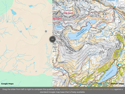 Then there's the issue of detail. Zoom in to any city on your phone maps app and compare it with an area of countryside. Chances are it will look like there's nothing there. Check out our useful Map Comparison Slider to see the difference between the mapping of Snowdon (Yr Wyddfa) on Google Maps vs the HARVEY Snowdonia North Superwalker 1:25,000 scale map.